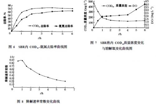 由于乳品廢水本身的特性,在采用傳統(tǒng)好氧工藝處理乳品廢水時,很容易發(fā)生污泥膨脹現(xiàn)象,造成污泥流失,水質(zhì)惡化,嚴(yán)重者會導(dǎo)致工藝無法正常運行. 因此解決污泥膨脹問題對生物處理廢水是極為重要的. SBR工藝可有效的控制SVI值,從而有效的抑制污泥膨脹. 而SBR池的反應(yīng)時間的長短直接影響著水中有機物和氨氮的降解程度,決定了出水CODcr質(zhì)量濃度和氨氮質(zhì)量濃度的大小.SBR池內(nèi)CODcr、氨氮去除率曲線如圖6 所示. 隨著SBR內(nèi)反應(yīng)時間的延長, CODcr和氨氮的去除率均逐漸提高,但當(dāng)停留時間達(dá)到4 h以后,CODcr去除率開始下降,而氨氮的去除率則是沒有太大的升高, CODcr去除率下降是由于曝氣過量,污泥被解體而引起廢水中COD值升高的緣故.SBR池在反應(yīng)過程中有機物的降解速率,受到供氧速率、污泥質(zhì)量濃度以及有機物質(zhì)量濃度多方面的影響,氧氣的供應(yīng)是影響有機物降解速率的一個重要因素. 因此本試驗探討了SBR池內(nèi)CODcr質(zhì)量濃度變化與溶解氧變化關(guān)系如圖7所示.降解速率常數(shù)變化曲線如圖8所示,從圖8可以看出,在開始的兩個小時內(nèi),降解速率變化較大,并在1 h時出現(xiàn)最大值0. 75,即此時有機物降解速率最快,在以后4 h逐漸趨于平穩(wěn),則有機物質(zhì)量濃度的大小影響有機物降解速率.