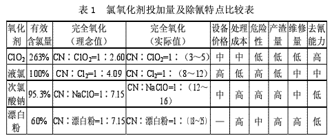 含氰廢水處理工藝包括堿性氯化法、離子交換法、電解法等多種處理方法。在工程實(shí)踐中,采用較多的是兩級(jí)堿性氯化法處理工藝,該方法穩(wěn)定、可靠,且成本較低,易于自控。氯化劑可采用液氯、次氯酸鈉、二氧化氯、漂白粉等。根據(jù)經(jīng)驗(yàn)數(shù)據(jù)比較,幾種氯氧化劑消耗量與處理效果具體比較見(jiàn)表1。