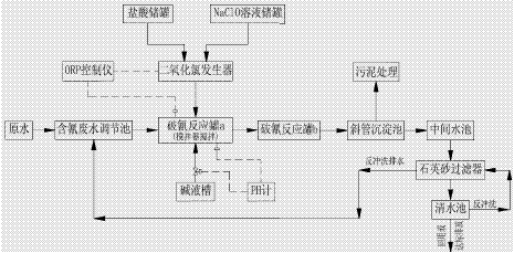 某電鍍生產(chǎn)線排放含氰廢水,廢水量3m3/h,CN-30mg/L,采用二段式堿性氯化法,具體工藝設(shè)計(jì)流程見(jiàn)圖1。