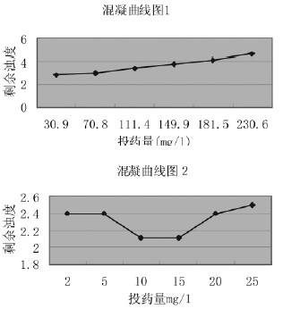 以投藥量為橫坐標(biāo),以剩余濁度為縱座標(biāo),繪制投藥量剩余濁度曲線,從曲線上可求得10mg /l 為最佳投藥量值。