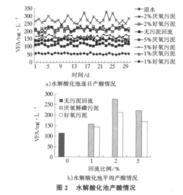 從圖2 還可以發(fā)現(xiàn), 厭氧釋磷污泥回流水解產(chǎn)生的VFA 量均高于同等回流比下的好氧污泥產(chǎn)生量。筆者分析原因主要有兩個: 1) 厭氧釋磷污泥與水解池中的優(yōu)勢菌相容性強, 有利于提高水解效率; 2) 厭氧釋磷污泥胞外聚合物( EPS) 量多, 利于水解。從圖2 還可以看出, 2%厭氧釋磷污泥回流水解產(chǎn)生的VFA量最大, 均值為275 mg/ L。理論上分析, 較高的回流比更能提高水解單元的傳質(zhì)效率, 從而強化水解酸化效果, 即污泥回流比5%應比2%時產(chǎn)生更多的VFA, 但其產(chǎn)生量為220 mg/ L, 低于275 mg/ L。筆者分析原因可能為: 較高的回流比在強化水解酸化池內(nèi)的水力條件的同時也增加了其內(nèi)的有機負荷, 一方面使水解細菌與基質(zhì)的接觸機會和時間減少; 另一方面, 高有機負荷容易引起絲狀菌瘋長, 不利于污泥穩(wěn)定, 不利于水解池穩(wěn)定產(chǎn)酸。