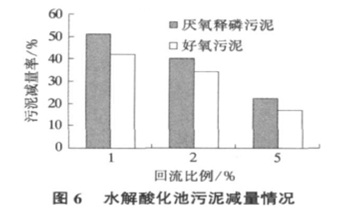 由圖6 知, 不論是厭氧釋磷污泥還是好氧污泥回流到水解池均能得到一定程度的降解, 達到污泥減量效果, 且污泥減量率均隨由圖6 知, 不論是厭氧釋磷污泥還是好氧污泥回流到水解池均能得到一定程度的降解, 達到污泥減量效果, 且污泥減量率均隨污泥回流比例的增加而減少。以厭氧釋磷污泥為例, 污泥減量率由50%( 回流比1%) 降至40%( 回流比2%) 。分析原因為: 污泥水解酸化促使水解池中溶解性COD( SCOD) 增多, SCOD 的增加導致VFA 產(chǎn)量增加, 因此, VFA 產(chǎn)生量與污泥水解的量成正相關(guān)。當回流厭氧釋磷污泥時, 1%回流比條件下的污泥回流總量是2% 時的50%, 而1%( 158 mg/ L) 回流比條件下VFA 產(chǎn)量為2%( 275 mg/ L) 時的58% ( 可以理解為污泥水解量的比值) 。因此, 1%比2%時的水解酸化污泥減量率要高。具體參見http://wlmqsb.com更多相關(guān)技術(shù)文檔。