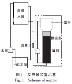 反應(yīng)器由圓柱形有機玻璃加工而成,反應(yīng)區(qū)有效體積15 L,反應(yīng)器半徑100 mm,高徑比為10 ∶1。反應(yīng)器安裝在恒溫室中,溫度可在10 ~ 40 ℃之間調(diào)節(jié),反應(yīng)器內(nèi)添加聚氯乙烯梅花型填料,微生物可附著生長、繁殖,形成掛膜性能良好的生物復(fù)合體,有回流作用,能有效地截留和吸附廢水中的顆粒性物質(zhì)和膠體物質(zhì),可形成懸浮相污泥復(fù)合體。采用內(nèi)循環(huán)式,反應(yīng)器內(nèi)循環(huán)由蠕動泵控制,廢水由進(jìn)水泵打入高位水箱, 再由流量計計量進(jìn)入主反應(yīng)區(qū),由出口排出。反應(yīng)器裝置如圖1 所示。