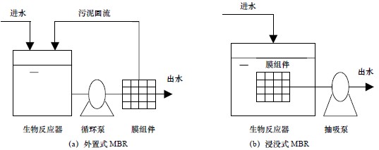 MBR 一般由生物反應(yīng)器、膜組件和泵三部分組成。根據(jù)生物反應(yīng)器和膜組件的設(shè)置位置和加壓方式分為外置式(External)和浸沒式(Internal)[3]兩種,如圖1 所示。