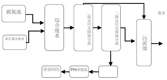 含氰廢水經(jīng)過傳統(tǒng)破氰后與其它廢水混合,然后進(jìn)行一級處理工藝。通常此步就可以使重金屬達(dá)標(biāo),及大幅度降低磷、氨氮、COD等。具體實(shí)施為,加入復(fù)合藥劑1及其它助劑,調(diào)節(jié)PH,然后固液分離。