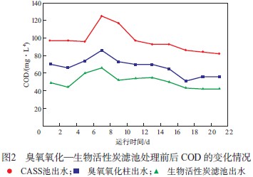 臭氧氧化—生物活性炭濾池處理前后 COD的變化情況見圖 2。