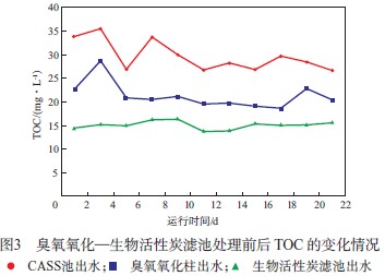臭氧氧化—生物活性炭濾池處理前后 TOC的變化情況見圖 3。由圖 3 可見:臭氧氧化—生物活性炭濾池對(duì) TOC 的削減規(guī)律與 COD 近似;CASS 池出水 TOC 為26.6~35.5 mg/L;經(jīng)臭氧氧化后 TOC 下降至 18.6~28.7 mg/L,臭氧氧化柱的平均 TOC 去除率為 28.1%;臭氧氧化柱出水進(jìn)一步經(jīng)生物活性炭濾池處理后,TOC 下降到13.7~16.3 mg/L,平均為 15.1 mg/L,生物活性炭濾池的平均 TOC 去除率為 29.3%;系統(tǒng)平均總TOC 去除率為48.8%。