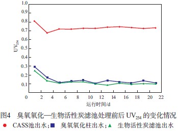 臭氧氧化—生物活性炭濾池處理前后 UV254的變化情況見圖 4。由圖 4 可見:CASS 池的出水UV254 較高,為 0.68~0.80;經(jīng)臭氧氧化后臭氧氧化柱出水 UV254 下降到 0.11~0.29,臭氧氧化柱的平均UV254 去除率達(dá) 80.6%;再經(jīng)生物活性炭濾池降解后出水 UV254 降至 0.09~0.24,平均為 0.12,生物活性炭濾池的平均 UV254 去除率為 16.0%;系統(tǒng)平均總 UV254 去除率達(dá) 83.7%。由此可見,UV254 主要通過臭氧氧化去除,生物活性炭對(duì) UV254 的去除效果明顯。Wang 等[13]的研究同樣表明臭氧氧化對(duì)UV254 的去除占主導(dǎo)作用。UV254 通常用以表征具有芳香環(huán)結(jié)構(gòu)或共軛雙鍵結(jié)構(gòu)的有機(jī)物[14],而臭氧能夠與有機(jī)物中的 C C 和 C O 反應(yīng),破壞苯環(huán)結(jié)構(gòu)或使有機(jī)物的芳香性降低甚至消失,由此導(dǎo)致 UV254 的降低[15]。