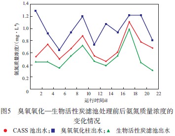 臭氧氧化—生物活性炭濾池處理前后氨氮質(zhì)量濃度的變化情況見圖 5。由圖 5 可見:CASS池出水的平均氨氮質(zhì)量濃度為 0.68 mg/L,經(jīng)臭氧氧化后平均氨氮質(zhì)量濃度為 1.00 mg/L,不僅沒有下降,反而有所升高,上升約 46.3%。原因可能在于:臭氧能把水中的有機(jī)氮和蛋白性氮氧化為氨氮,同時(shí)氨氮的化學(xué)穩(wěn)定性較強(qiáng),不易與臭氧反應(yīng),從而引起氨氮質(zhì)量濃度升高[16]。由圖 5 還可見:臭氧氧化柱出水經(jīng)生物活性炭濾池降解后平均氨氮質(zhì)量濃度降至 0.51 mg/L,生物活性炭濾池的平均氨氮去除率為 48.5%;系統(tǒng)平均總氨氮去除率為 24.7%。上述結(jié)果表明,氨氮的去除主要依靠生物活性炭的生物氧化作用。