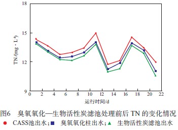 臭氧氧化—生物活性炭濾池處理前后 TN 的變化情況見圖 6。由圖 6 可見,CASS 池的出水 TN為 11.73~14.56 mg/L,經(jīng)臭氧氧化后臭氧氧化柱出水 TN 為 11.06~14.05 mg/L,再經(jīng)生物活性炭濾池處理后出水 TN 為 10.54~13.87 mg/L,系統(tǒng)對(duì) TN的去除效果不明顯。這可能是由于臭氧出水中含有較高的溶解氧導(dǎo)致系統(tǒng)內(nèi)溶解氧比較充足,不具備反硝化菌生長(zhǎng)的條件,因此幾乎未發(fā)生反硝化,僅靠同化作用去除了少量總氮。