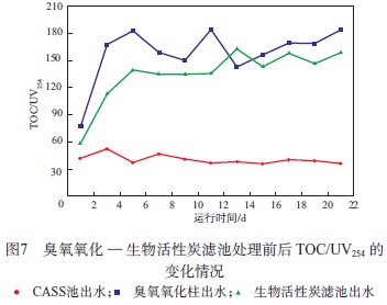 由圖 7 可見:CASS 池出水的 TOC/UV254 為35.9~52.4,具有一定的可生化性;經(jīng)臭氧氧化后TOC/UV254 升至 79.0~184.3,平均提高 290%。表明臭氧氧化有效提高了廢水的可生化性[14],臭氧將一些難降解有機(jī)物氧化為可生化溶解性有機(jī)碳,有利于后續(xù)生物活性炭的有效去除[18]。經(jīng)生物活性炭濾池降解后出水 TOC/UV254 為 59.6~162.7,比臭氧氧化后的 TOC/UV254 略有下降。