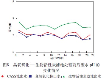 臭氧氧化—生物活性炭濾池處理前后廢水 pH的變化情況見圖 8。由圖 8 可見:CASS 池出水 pH為 6.85~7.28;臭氧氧化柱出水 pH 為6.81~7.18,平均下降 0.10。廢水 pH 的小幅下降可能是由于臭氧通過氧化作用將部分大分子有機(jī)物質(zhì)分解為小分子有機(jī)酸或醛類物質(zhì)所致。經(jīng)生物活性炭濾池處理后,出水 pH 上升到 7.38~7.77,較臭氧氧化柱出水平均升高了 0.60。這可能是由于臭氧氧化生成的有機(jī)酸或醛類物質(zhì)最終在生物氧化作用下轉(zhuǎn)變?yōu)?CO2 和 H2O,同時(shí)曝氣過程對(duì) CO2具有吹脫作用。具體參見http://wlmqsb.com更多相關(guān)技術(shù)文檔。