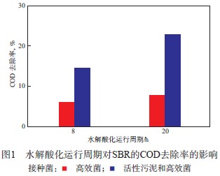 由圖1可見:活性污泥和高效菌SBR的COD去除率明顯高于高效菌SBR;當(dāng)水解酸化運(yùn)行周期由8 h增至20 h時(shí),活性污泥和高效菌SBR的COD去除率由14.0%增至22.0%;高效菌SBR的COD去除率增加不明顯,均為6.0%左右。這是由于活性污泥和高效菌混合后,生物相更加豐富,通過環(huán)境的馴化能夠形成適合水解酸化處理濕法腈綸廢水的高效微生物菌群。