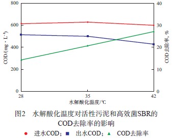 當(dāng)水解酸化運(yùn)行周期為20 h時(shí),水解酸化溫度對活性污泥和高效菌SBR的COD去除率的影響見圖2。由圖2可見:隨水解酸化溫度的升高,COD去除率逐漸增加;當(dāng)水解酸化溫度為42℃時(shí),COD去除率為26.0%,BOD5/COD由0.37提高至0.39。由于傳統(tǒng)活性污泥法的最高反應(yīng)溫度為35℃[12],為此廢水廠需對廢水進(jìn)行降溫。而本方法可在較高溫度下進(jìn)行,既有效提高了水解酸化工段的處理效果又降低了處理成本。