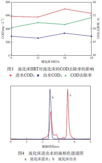 流化床HRT對流化床的COD去除率的影響見圖3。由圖3可見:隨流化床HRT的增加,COD去除率略有增加;當(dāng)流化床HRT為20 h時(shí),流化床的COD去除率為54%,出水COD降至300 mg/L左右。由此可見,延長流化床HRT有助于提高COD的去除率。