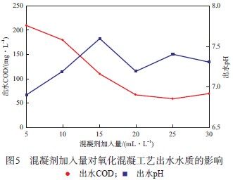 混凝劑加入量對氧化混凝工藝出水水質(zhì)的影響見圖5。由圖5可見:隨混凝劑加入量的增加,出水COD逐漸下降;當(dāng)混凝劑加入量為15 mL/L時(shí),出水COD降至66 mg/L,去除率可達(dá)76.0%以上,出水pH約為7.4。氧化混凝劑及助凝劑的使用成本約為1.2元/m3,由此可見該方法經(jīng)濟(jì)、簡便,適于實(shí)際應(yīng)用。具體參見http://wlmqsb.com更多相關(guān)技術(shù)文檔。