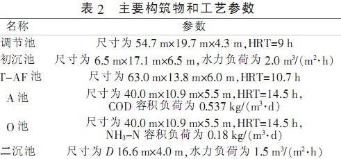 生產(chǎn)廢水首先進入調(diào)節(jié)池調(diào)節(jié)水質(zhì)水量然后由提升泵提升至初沉池去除廢水中的SS出水自流進3T-AF池在3T-AF池內(nèi)進行反硝化以去除廢水中的NO3--NNO2--N和部分COD同時通過厭氧作用提高廢水的可生化性3T-AF池出水進入A/O池進一步去除氨氮和有機物O池的出水部分回流至A池進行反硝化脫除總氮并將二沉池的部分污泥回流至A池保持整套A/O系統(tǒng)的污泥濃度在O池中通過硝化菌的作用將氨氮轉(zhuǎn)化成NO3--N和NO2--NO池中的硝化液回流至A池中進行反硝化脫氮控制回流比21左右二沉池出水達標排放。主要構(gòu)筑物和參數(shù)見表2。