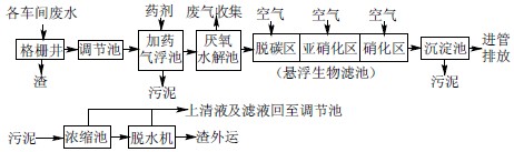 采用調(diào)節(jié)池- 加藥氣浮池- 厭氧水解池- 懸浮生物濾池- 沉淀池組合工藝成功處理了紡織印染助劑生產(chǎn)廢水,各項(xiàng)指標(biāo)均達(dá)到排入管網(wǎng)的標(biāo)準(zhǔn)。