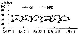從圖7分析,硬度(以Ca2+硬度計)和總堿度的去除率分別為40%、52%:處理后的水質(zhì)明顯得到改善。硬度去除反應(yīng)原理為: