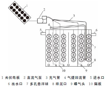 光伏曝氣系統(tǒng)主要由單晶硅光伏電板、直流氣泵、充氣管和曝氣頭組成。氣泵直接與光伏電板連接,污水回流采用氣提回流,氣泵同時實現(xiàn)曝氣和回流。