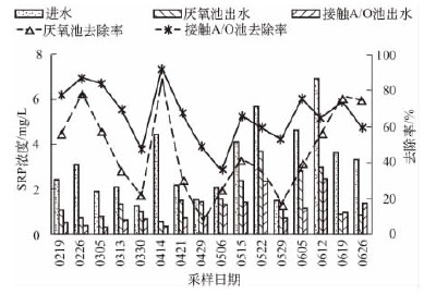 中試裝置進出水磷的變化如圖5和圖6所示。在整個運行期內(nèi),厭氧池和光伏A/O池對SRP的平均去除率分別為46.0%和66.3%,對TP的平均去除率為39.3%和66.2%。