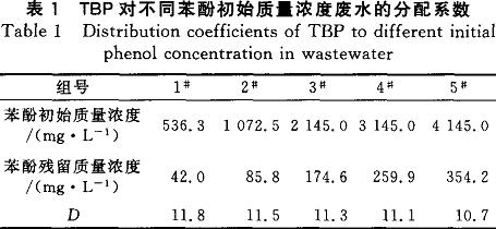 取6OmL廢水,置于250mL錐形瓶中,按油水比為1:3(體積比)加入2OmLTBP,在控溫磁力攪拌器上快速攪拌20min,于250mL分液漏斗中靜置分層,并重復(fù)上述操作進(jìn)行4級萃取。取一定量水相,測定其苯酚濃度,通過物料衡算可以得到有機(jī)相中苯酚濃度。
