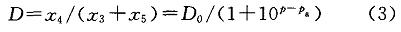 式中:.z、z分別為有機(jī)相苯酚、水相中游離苯酚的摩爾濃度,mol/L;D。為理論分配系數(shù);P為pH;P為酸堿解離常數(shù)(pK)。因為pK=9.87,所以酸性條件下可認(rèn)為D=D。。則式(2)和式(3)式可以轉(zhuǎn)換為: