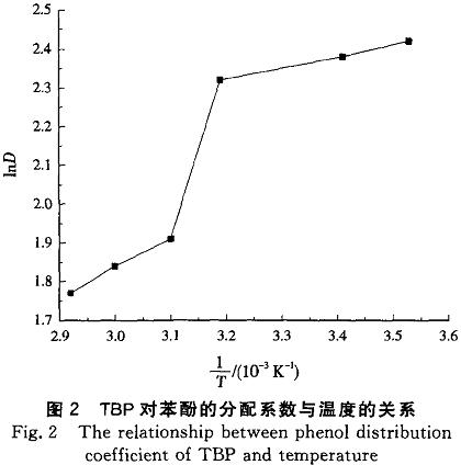 圖2是TBP對苯酚的分配系數(shù)與溫度的關(guān)系。經(jīng)線性擬合,可以求得TBP對苯酚的焓變?yōu)橐?O.1kJ/mol,與文獻(xiàn)E19]報道的數(shù)值相近。一般,氫鍵的能量為4.2~42.0kJ/mol,因此也可認(rèn)為TBP與苯酚之間形成了氫鍵締合物。由焓變可以確定,TBP與苯酚的絡(luò)合過程是一個放熱的過程,高溫不利于萃取進(jìn)行,因此在室溫下進(jìn)行苯酚萃取是合理的。