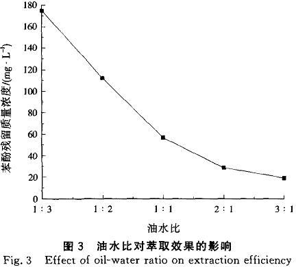 由圖3表明,隨著油水比的增大,苯酚殘留濃度減少,即苯酚在TBP中的分配系數(shù)增大,這是由于苯酚分子周圍有更多的TBP分子,增加了氫鍵締合的機(jī)率。但是增大油水比雖有較好的萃取效果,卻大幅度降低了單次廢水的處理量,對于工業(yè)廢水的處理除考慮效果外還要兼顧效率,因此油水比選擇更適合工業(yè)實際的1:3。