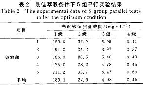 通過單因素實驗,確定了TBP對苯酚的最佳萃取條件:室溫,油水比1:3,萃取時問20min,4級萃取。在最佳萃取條件下進(jìn)行5組平行實驗,結(jié)果見表2。每組實驗結(jié)果都較穩(wěn)定,4級萃取后苯酚殘留質(zhì)量濃度平均值為0.45mg/L,達(dá)到GB8978~1996中揮發(fā)酚一級排放標(biāo)準(zhǔn)。