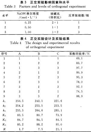 從表4可以看出,NaOH濃度對苯酚回收率的影響最小。在反萃取過程中,NaOH起到解絡(luò)合的作用,在反萃取體系中要有足夠的自由堿濃度,才能保證反萃取的進(jìn)行。
