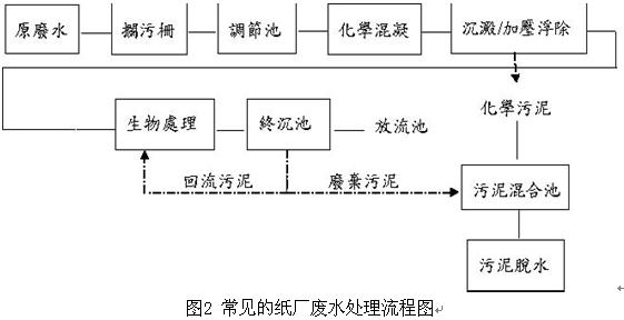 造紙流程雖因原料與產(chǎn)品特性的不同而略有差異,但基本上可分為制漿及抄紙兩個(gè)系統(tǒng),廢水亦主要來自制漿及抄紙單元,前者以制漿程序的散漿調(diào)成用水量最多,含大量纖維與懸浮固體物,水質(zhì)較為單純,后者因添加大量抄紙化工藥品,還含有抄紙網(wǎng)部所流失的微細(xì)纖維、殘余抄紙藥劑及有機(jī)物質(zhì),水質(zhì)復(fù)雜,一般造紙流程如圖1。