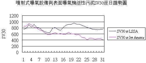 本研究為在原曝氣槽設(shè)一旁通管引入經(jīng)化學(xué)混凝沉淀后的出流水,設(shè)置一容積約50m3(尺寸為5m×2m×5mH,有效水深4.5m)的曝氣槽及表面負(fù)荷率為25m3/m2-day的終沉池一座,回流污泥比設(shè)定為100%。曝氣槽中設(shè)于一組噴射式曝氣攪拌器,同時(shí)連接一組魯氏鼓風(fēng)機(jī)提供氣源。在連續(xù)操作一個(gè)月后,逐日記錄SV30數(shù)據(jù),以分析在設(shè)置噴射式曝氣攪拌系統(tǒng)與原使用低速表面曝氣器的污泥沉降情形的差異。具體參見http://wlmqsb.com更多相關(guān)技術(shù)文檔。