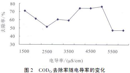 CODCr去除率隨電導(dǎo)率變化趨勢(shì)見圖2。