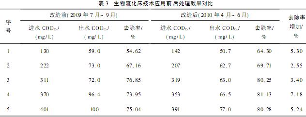 2009年10月,為進(jìn)一步提高多項(xiàng)膜生物反應(yīng)器的處理效果,哈爾濱石化公司應(yīng)用生物流化床技術(shù)對(duì)水解酸化和一級(jí)好氧單元進(jìn)行了改造,即在上述兩單元添加軟性填料,增加試驗(yàn)微生物的生物量。經(jīng)過4個(gè)月,水解酸化單元完成了掛膜,7個(gè)月后一級(jí)好氧的前四分之一區(qū)開始掛膜。經(jīng)過微生物鏡檢,發(fā)現(xiàn)鐘蟲、草履蟲、輪蟲等原生動(dòng)物開始產(chǎn)生并逐漸增多,說明生物系統(tǒng)的菌種豐富、世代周期延長(zhǎng)、功能趨于穩(wěn)定,污染物的去除效果也有所增強(qiáng)。生物流化床技術(shù)應(yīng)用前后處理對(duì)比結(jié)果見表3。