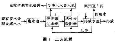 現(xiàn)有廢水處理設(shè)施的出水自流進(jìn)人集水池:集水池中的廢水提升進(jìn)入過(guò)濾器.以壓力過(guò)濾方式除去廢水中的大部分懸浮物質(zhì):過(guò)濾器出水水質(zhì)指標(biāo)如符合排放標(biāo)準(zhǔn)。則可直接進(jìn)入排放水池達(dá)標(biāo)排放:如不達(dá)標(biāo)則利用剩余壓力進(jìn)入活性炭吸附器。通過(guò)活性炭的吸附作用。除去廢水中的有機(jī)污染物;活性炭吸附器出水進(jìn)人排放水池,一部分提升回用至生產(chǎn)車(chē)間,其余自流排放。采用處理出水對(duì)過(guò)濾器和活性炭吸附器進(jìn)行反沖洗,反沖洗出水回流到調(diào)節(jié)池二次處理。