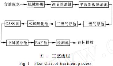 含油廢水首先經(jīng)過機(jī)械格柵攔截大塊雜物,再經(jīng)提升泵房提升至調(diào)節(jié)除油罐。除油罐對廢水中的污油和固體顆粒均有一定的去除作用。除油罐的出水自流進(jìn)入平流斜板隔油池。經(jīng)隔油處理后的廢水再自流進(jìn)入氣浮除油階段,該階段分為兩級,一級采用渦凹?xì)飧,二級采用部分回流加壓溶氣氣浮。廢水通過以上物化處理后,基本完成除油任務(wù),同時(shí)約有20%~30%的有機(jī)污染物也得到去除,隨后進(jìn)入生化處理階段。