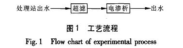 試驗地點為大慶采油二廠聚南八污水站(采用自然沉降、混凝、兩次壓力過濾工藝),其出水先進入超濾膜進行預處理,然后進入電滲析裝置。調節(jié)電滲析的電壓分別為5、10、15、20、25、30V,固定濃水和極水流量均為50L/h,調節(jié)淡水流量為100、150、200、250、300I/h進行脫鹽試驗。具體工藝流程見圖1。
