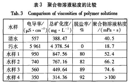 2.2.2回用作配液用水時的脫鹽率要求利用電滲析出水配制1000mg/L的聚合物溶液,測定其粘度并與用清水配制的作比較,結果見表3。