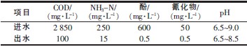 包鋼焦化廠現(xiàn)有10 座焦?fàn)t,焦炭年生產(chǎn)能力465 萬t,有焦化廢水處理站2 座,其中第二廢水處理站處理規(guī)模為350 m3/h,屬于國內(nèi)大型焦化廢水處理設(shè)施之一。第二廢水處理站于2007 年底投產(chǎn),采用A/O2 法生物脫氮工藝,其廢水主要來源于蒸氨廢水、焦化副產(chǎn)品回收及精制過程中產(chǎn)生的廢水、煤氣管道水封排水以及包鋼燃?xì)廨啓C(jī)發(fā)電系統(tǒng)廢水等。其設(shè)計進(jìn)出水水質(zhì)如表1 所示。
