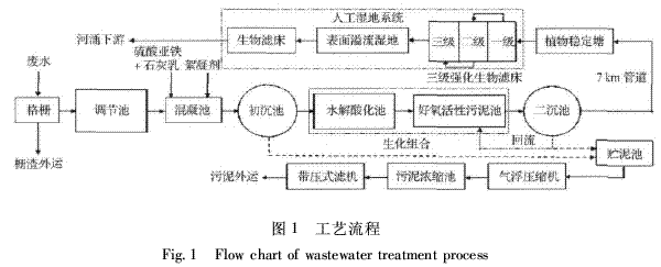 根據(jù)綜合印染廢水污染物水量大、成分復(fù)雜、色度深和可生化性差等特點(diǎn),采用生化-植物穩(wěn)定塘-人工濕地系統(tǒng)工藝進(jìn)行處理,其工藝流程如圖1所示。