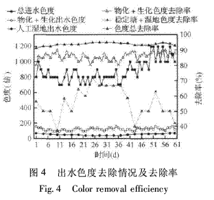 常規(guī)物化+生化組合和植物穩(wěn)定塘-人工濕地系統(tǒng)區(qū)段進(jìn)出水色度及色度去除效果如圖4所示,系統(tǒng)總進(jìn)水色度為650~1 200倍,平均877倍。跟SS一樣,前40天色度波動較小,在650~900倍之間,平均807倍;第40天后,進(jìn)水色度范圍為800~1200倍,波動較大,極差達(dá)400倍,是最低值的1/2,進(jìn)水平均值1 033倍。經(jīng)物化+生化組合前40天出水色度平均120倍,后20天平均130倍,出水色度平均為123倍,平均去除率約86.0%;經(jīng)植物穩(wěn)定塘-人工濕地系統(tǒng)深度處理后,出水波動較少,出水平均值為50倍左右,去除率為55.6%;整個(gè)系統(tǒng)工藝平均總?cè)コ蔬_(dá)93.8%。植物穩(wěn)定塘-人工濕地系統(tǒng)對色度深度去除效果明顯,色度值降低了一半以上。由于印染廢水中含有難生化降解的PVC、化學(xué)助劑等,常規(guī)物化+生化組合不能將其中復(fù)雜分子結(jié)構(gòu)的顯色集團(tuán)徹底破壞,導(dǎo)致出水色度值較高。增加了植物穩(wěn)定塘-人工濕地系統(tǒng)后,易被吸附降解的色度得到去除,但殘余物質(zhì)的顯色使得出水色度時(shí)有略超過50倍,只達(dá)到基本排放標(biāo)準(zhǔn),故此工藝仍有改進(jìn)的空間。