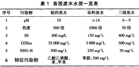 對(duì)來(lái)水進(jìn)行綜合分析,主要特點(diǎn)如下:進(jìn)水水質(zhì)變化大,具有較強(qiáng)沖擊性;BODJCODcr較低,廢水的可生化性較差;氨氮濃度和色度均較高;有一定的毒性,對(duì)微生物有抑制作用?傮w來(lái)看,主要難度在于制藥中間體廢水和染料廢水的處理。