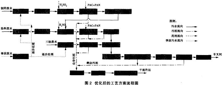 根據(jù)對(duì)來(lái)水水質(zhì)的分析和現(xiàn)有工藝不足的分析,結(jié)合工業(yè)園區(qū)的實(shí)際情況,該項(xiàng)設(shè)施擴(kuò)建仍然采用“物化”+“生化”的工藝方案,在原有方案基礎(chǔ)上進(jìn)行優(yōu)化改造,工藝流程如圖2所示。主要工藝優(yōu)化措施如下。