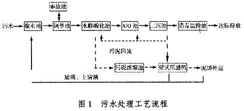 污水經(jīng)過(guò)機(jī)械格柵攔截,篩除水中尺寸較大的懸浮、漂浮物后,自流進(jìn)入集水池,池內(nèi)設(shè)置COD、pH、溫度等在線監(jiān)控儀表,監(jiān)測(cè)進(jìn)水中的各項(xiàng)指標(biāo)。水質(zhì)符合設(shè)計(jì)要求排至調(diào)節(jié)池,超標(biāo)時(shí),排至事故池。事故池附帶酸堿加藥裝置,內(nèi)設(shè)曝氣攪拌系統(tǒng),應(yīng)急處理進(jìn)水水質(zhì)異常波動(dòng),處理后通過(guò)潛污泵小流量混入調(diào)節(jié)池。調(diào)節(jié)池內(nèi)設(shè)曝氣攪拌系統(tǒng),使污水水質(zhì)充分混合,防止懸浮物沉積。調(diào)節(jié)池出水由提升泵輸送至水解酸化池,提高廢水的可生化性。然后進(jìn)入缺氧池和好氧池進(jìn)行生物處理,去除水中的COD和氨氮,凈化污水。好氧池中混合液按4OO一500%回流進(jìn)入缺氧段,剩余混合液流人二沉池進(jìn)行泥水分離,底部污泥部分回流至缺氧段與來(lái)自水解酸化池得污水混合,污泥回流比50—100%,二沉池上層清液排入消毒池。消毒池采用CIO消毒,污水然后經(jīng)過(guò)在線監(jiān)控池達(dá)標(biāo)排放。