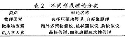 顆粒污泥的形成過(guò)程是一個(gè)包含物理、化學(xué)和生物作用的復(fù)雜過(guò)程,這個(gè)過(guò)程可以看作是在流體動(dòng)力條件下.微生物自固定所形成的生物體聚團(tuán)現(xiàn)象。由于操作條件、反應(yīng)器類(lèi)型、進(jìn)水水質(zhì)、培養(yǎng)目的不同,因此現(xiàn)有的形成機(jī)理并不能詮釋所有顆粒污泥的形成情況。表2對(duì)不同的理論作了一個(gè)歸類(lèi)。