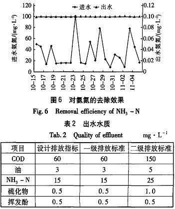 該污水處理廠自2003年6月運行以來,經(jīng)過前期的調(diào)試和運行經(jīng)驗的積累,現(xiàn)在的運行情況良好,對各類污染物的處理效果見圖2—6。由圖可以看出,進水水質(zhì)變化非常劇烈,水質(zhì)也較差。對于出水水質(zhì),大連石化分公司在實際運行中執(zhí)行《污水綜合排放標準》(GB8978--1996)與遼寧省地方標準《遼寧省沿海地區(qū)污水直接排人海域標準》(DB21-59-89),要求必須達到其中的二級標準,力爭達到一級標準,具體指標如表2所示。從實際運行結(jié)果來看,出水完全能夠達到一級排放標準,同時也達到了設(shè)計指標,但是從出水監(jiān)測的數(shù)值來看,出水中的油含量有兩次未達到一級排放標準,而達到3.5mg/L,分析原因為DCI除油裝置和DFA氣浮裝置在此期間運行不太正常所致。