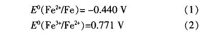 海綿鐵作為水處理材料使用時(shí),其中的金屬鐵是主要化學(xué)成分。鐵是活潑金屬,其在水溶液中的電極電位較低,具有還原能力,可將金屬活動(dòng)順序表中排于其后的金屬置換出來(lái)而沉積在鐵的表面,還可將氧化性較強(qiáng)的離子、化合物及某些有機(jī)物還原。在水溶液中,F(xiàn)e2+也具有一定的還原性,存在強(qiáng)氧化劑時(shí)。Fe2+可進(jìn)一步被氧化成Fe3+,F(xiàn)e2+及Fe的電極電位如式(1)和式(2)所示。