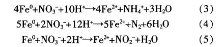 馮艷萍等利用自制的球形海綿鐵對(duì)水體中硝酸鹽的去除進(jìn)行了實(shí)驗(yàn)研究.結(jié)果表明:溶液初始pH對(duì)硝酸鹽的去除率影響顯著,pH<2時(shí),硝酸鹽的去除率在63.29%以上,而pH>2后,硝酸鹽的去除率急劇降低,只有20%左右。這與溶液發(fā)生的電化學(xué)反應(yīng)有關(guān)。S.Choe等[35認(rèn)為零價(jià)鐵金屬在去除硝酸鹽的過(guò)程中,可能發(fā)生如下的化學(xué)反應(yīng):