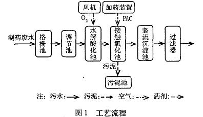 貴陽(yáng)三源藥業(yè)有限公司的制藥廢水先進(jìn)人污水處理站格柵池,格柵池內(nèi)設(shè)有人工格柵和細(xì)格網(wǎng),去除污水中較大的漂浮物后自流進(jìn)人調(diào)節(jié)池,使污水水質(zhì)與水量均和,再由污水提水泵提升進(jìn)人水解酸化池。在池中水解酸化菌作用下,制藥廢水中的難降解大分子有機(jī)物轉(zhuǎn)變?yōu)橐捉到庑》肿佑袡C(jī)物。水解酸化池出水自流進(jìn)入接觸氧化池,在鼓風(fēng)供氧的條件下,利用好氧微生物(優(yōu)勢(shì)菌)對(duì)復(fù)雜的有機(jī)物進(jìn)行分解,轉(zhuǎn)化為穩(wěn)定無害的無機(jī)物如CO、H0等。接觸氧化池出水與投加在集水堰槽的混凝藥劑聚合氯化鋁(PAC)混合后進(jìn)人豎流沉淀池進(jìn)行沉淀,利用PAC絮凝去除污水中的小顆粒懸浮物和微生物殘骸。豎流沉淀池出水經(jīng)過濾器過濾后排放。